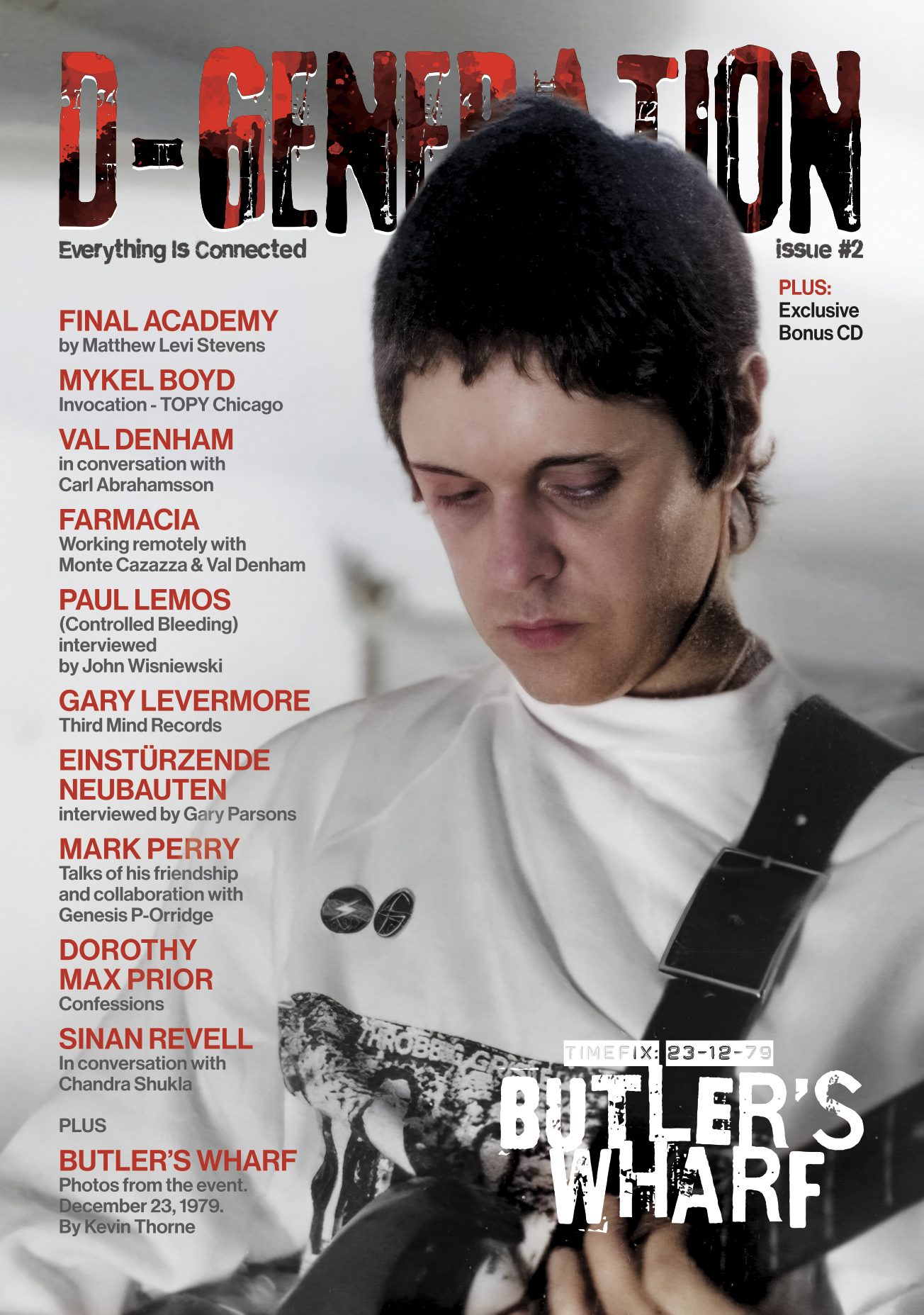 Matthew Levi-Stevens talks about the infamous Final Academy; Mykel Boyd discusses TOPY Chicago; Val Denham chats with Carl Abrahamsson; Farmacia talk about working with Monte Cazazza and Val Denham; Paul Lemos (Controlled Bleeding) talks with John Wisniewski; Gary Levermore talks about Third Mind Records; Gary Parsons interviews Einstürzende Neubauten; Mark Perry discusses working with Genesis P-Orridge; Dorothy "Max" Prior confesses; Sinan Revell talks about SPK with Chandra Shukla and I show off some of my TG photos from Butler's Wharf.